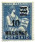 In 1921 the stamps were surcharged in Egyptian currency, at the rate of about 2.5 centimes per milieme. Several forms of the surcharge exist. In Alexandria, local surcharges read "4 Mill." etc., while in Port Said they read "4 / Milliemes", with the number in a sans-serif typeface. Soon after Paris-produced surcharges arrived in both offices; they read "4 / MILLIEMES" etc. A new round of surcharges in 1925 added black bars to obscure the French currency values.