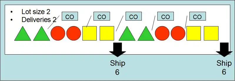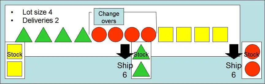 If we take this to the extreme where the factory now has a changeover after every unit of production (single piece flow) and where shipments occur after every campaign (every product has been made) then the factory has this situation.