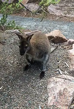 The red-necked wallaby, also called Bennett's wallaby (Macropus rufogriseus), is one of the most commonly seen animals within the park and can be spotted grazing on low lying vegetation such as grass, they are also known to gather around people.[9] Another common species seen is the eastern quoll (Dasyurus viverrinus), a marsupial carnivore which was previously sighted on the mainland of Australia but is now only found in Tasmania.[10] Also extinct on the mainland, the Tasmanian pademelon (Thylogale billardierii) is still common in Freycinet National Park but they are rarely seen during the day, coming out at night to feed.[11]