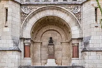 It soon became clear that the existing memorial gymnasium no longer met the growing demands of a national memorial. The German Gymnastics Association therefore decided to construct another memorial hall. In 1903, the Jahn Memorial Hall (Jahn-Ehrenhalle) was opened in the immediate vicinity of the gymnasium. It was deliberately designed as a place of national self-affirmation. This is expressed, among other things, in the richly decorated stained-glass windows showing the coats of arms of cities where German Gymnastics Festivals had been held.[8] During the 1936 Olympic Games in Berlin, Jahn's remains were transferred from the "Memorial Gymnasium" to the crypt on the grounds of the Jahn House.[9]
