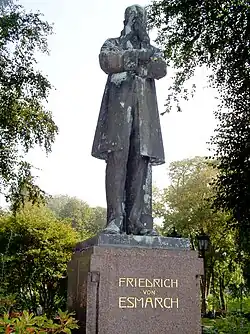 In 1854 Esmarch became director of the surgical clinic at Kiel, and in 1857 head of the general hospital and professor at the University of Kiel. During the Schleswig-Holstein War of 1864, Esmarch rendered good service to the field hospitals of Flensburg, Sundewitt and Kiel. In 1866 he was called to Berlin as member of the hospital commission, and also to take the superintendence of the surgical work in the hospitals there. When the Franco-Prussian War broke out in 1870, he was appointed surgeon-general to the army, and afterwards consulting surgeon at the great military hospital near Berlin.[1]