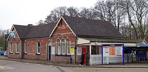 The line through Frimley is a link between the Waterloo to Reading line at Ascot and the Waterloo-Alton line at Ash Vale, although the line south from here initially joined the Woking to Basingstoke main line at Sturt Lane Junction. The station building was built in 1877 by the London and South Western Railway to serve this line, with the link to Ash Vale being opened the following year. The line was later electrified in January 1939.[1] The line becomes single south of the station and remains so as far as the junction with the line from Brookwood just short of Ash Vale station.