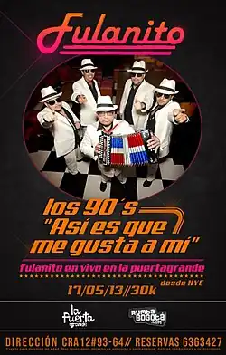 Fulanito is an American musical group based in Washington Heights in New York City. The group combines traditional merengue with elements of other genres such as house, hip hop, and bachata among others. With over five million albums sold throughout the world, they were at one time the top selling act in Colombia, and were placed on other charts including those of Japan, Switzerland, United States, and Chile. Their name means "Little John Doe" (i.e. unknown) in Spanish (see Fulano + -ito). Members of Fulanito had previously been in popular groups such as 740 Boyz and 2 in a Room.
