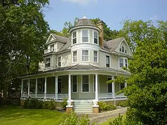While Queen Anne houses of its era would often have Eastlake detailing, this house is unusual for having ornament which is almost all Colonial Revival in style. These elements include a Palladian window, the simple Tuscan columns on the house's wraparound gallery, and denticular molding under the eaves of the main block and on the turret and dormer.[2]
