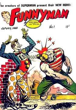 Siegel and Shuster's new creation, Funnyman, starred in a series that ran six issues (cover-dated Jan.–Aug. 1948).[3]