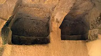 Originally, the complex had a long corridor which extended for around 14 metres in an east-west direction. A number of arcosolia are hewn into the walls. These vary in size, some having one trough-tomb, others having from three to five. Four of these tombs with headrests can still be identified.[1]