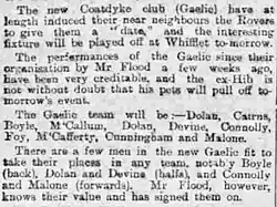 In May, Gaelic was ordered to pay expenses to Hamilton Academical for failing to find a team for a Lanarkshire Consolation Cup tie,[17] and, although the club entered the Scottish Qualifying Cup in 1895–96, this seems to have been something of a "flyer", given that a number of players had left for Albion Rovers.[18] Drawn at home to Kilmarnock Athletic, Flood telegraphed the Ayrshire side offering to scratch from the tie for a consideration, and the Reds offered £2 10/, which he accepted;[19] as membership of the Scottish FA was 5 shillings at the time,[20] and Gaelic never played again, Flood had gained something of a last laugh.