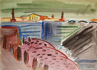 An avant-garde artist of Leningrad, Mendagaliev’s style is naïve. Vibrant colors and thick, heavy strokes form simple scenes that feel more symbolic than real.In each painting, there are repeated motifs: a table, a chimera, women, a bird, a fish. There appears to be a story begging to be told about the city he has lived in for so long, and, perhaps, a painful one. In the paintings, faces of people look in different directions, they pull from each other, guiding the viewer’s eyes into a chaos as the sphinx overlooks it all with a sense of doom. Then, there are portraits of chimeras and demons stalking individuals on the metro, women tormented next to a table or underwater beneath a fish in flight. They have a sinister tone to them. Fantastical, but simple, Mendagaliev’s works linger in the mind and resurface in the memory of St. Petersburg as a city.[3]