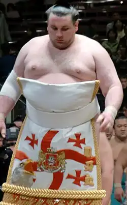 The January 2011 tournament was not a good one for Gagamaru. Having struggled to a 2–4 record after six days he went out drinking with fellow Georgian wrestler Kokkai and the pair allegedly got into a fight at an Indian restaurant in Tokyo's Sumida ward, causing damage to the property.[3] Both were reprimanded by the Sumo Association for staying out late during a tournament.[3] Gagamaru finished with a poor 5–10 record, resulting in demotion to maegashira 14. In the May Technical Examination Tournament he recovered from 4–7 down to win four in a row and get a winning record. In September 2011 after an opening day loss he then won ten in a row, including an emphatic victory over Baruto in his first ever meeting with an ōzeki.[4] He finished on 11–4 and was awarded his first special prize, for Fighting Spirit. He was promoted to maegashira 3 for the November 2011 tournament, but facing all the top wrestlers for the first time could only win two matches. However he turned things around in the January 2012 tournament, producing his best score to date of 12–3, sharing runner-up honours with yokozuna Hakuhō and two wins behind tournament winner Baruto.[5] He received his second Fighting Spirit prize for this performance.[6] For the March tournament Gagamaru was promoted to komusubi, becoming the first member of Kitanoumi stable to reach the san'yaku ranks since it was established in 1985.[7] He lost his first six matches, but performed better in the second week of the tournament, finishing with a respectable 6–9. As of the May 2012 tournament he once again represented Kise stable after it was permitted to re–open. Ranked at maegashira 2 in May he did defeat ōzeki Harumafuji but otherwise had an unremarkable tournament, finishing on 5–10.