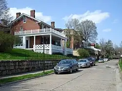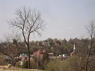 On Bench Street, most of the buildings are public or fraternal buildings, among them some of the district's principal churches. Viewed from the levee or the railroad tracks, the church steeples crown downtown.[6] Backdropping the prominent church steeples of Bench Street is the wooded terrace of Prospect Street. Prospect Street is mostly residential with the large old high school and its clock tower being the evident exception.[6] Northwest of Prospect Street the residential area continues. Many of the private homes in this area date from Galena's early days. The concentration of 19th-century homes, both beyond Prospect Street and on the opposite side of the Galena River, was labeled "astonishing" in the National Register nomination document.[6]