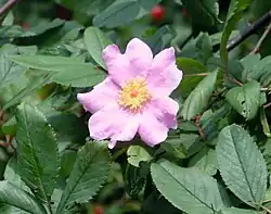 Swamp rose (Rosa palustris) on the bank of the Galien River August 2011.
