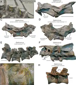 Gallimimus had 64–66 vertebrae in its spine, fewer than other ornithomimids. The centra (or bodies) of the vertebrae were platycoelous, with a flat front surface and a concave hind surface, except for the first six caudal (tail) vertebra—where the hind surface was also flat—and those at the end of the tail—which were amphiplatyan with both surfaces flat. Many of the centra had foramina (openings which have also been called "pleurocoels"), and were therefore probably pneumatic (with their hollow chambers invaded by air sacs). The neck consisted of 10 cervical vertebrae, which were all long and wide, except for the atlas bone (the first vertebra that connects with the back of the skull). The atlas differed from that of other ornithomimids in that the front surface of its intercentrum was slanted downwards towards the back, instead of being concave and facing upwards to support the occipital condyle. The neck appears to have been proportionally longer in relation to the trunk than in other ornithomimids. The neck was divided into two distinct sections: the cervical vertebrae at the front had centra which were nearly triangular in side view and tapered towards the back, as well as low neural arches and short, broad zygapophyses (the processes that articulated between the vertebrae); the cervical vertebrae at the back had spool-like centra which became gradually higher, and long, thin zygapophyses. The pneumatic foramina here were small and oval, and the neural spines projecting outwards from the centra formed long, low and sharp ridges, except for in the hindmost cervical vertebrae.[1][25]