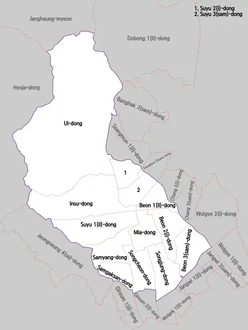 - Suyu-dong (수유동; 水踰洞); Legal dong is Suyu-dong