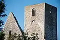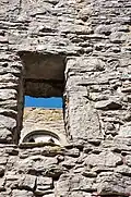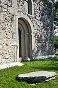 The stone church structure consists of a chancel, nave and tower. The tower rests on the west wall of the nave. The tower was presumably built in the late 13th century. The church was presumably abandoned as early as in the 16th century. The chancel and arch contain mural paintings. The church grounds and gardens were preserved in 1924 and are now a tourist destination.[4][5][6]