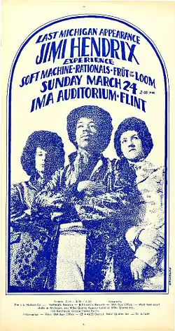 After Grimshaw's return to Detroit, promoter Russ Gibb hired him to perform light shows during rock performances at his new Grande Ballroom. Grimshaw designed the first poster for the Grande Ballroom, for a show on October 7, 1966, featuring the MC5 and billed as "A Dance Concert in the San Francisco Style".[4] At a party about the same time, he met John Sinclair, a poet and jazz critic who had just been released from six months in jail on a marijuana conviction. That was the first time that Sinclair heard the MC5 perform,[6] and he quickly became the band's manager and political mentor. Soon, Grimshaw was also designing posters for other bands performing at the Grande Ballroom and at other Detroit area rock music venues. His poster style was "psychedelic and heady, heavily embroidered with bright colors and flowing text."[6] According to Grimshaw, his major influences were Stanley Mouse, Rick Griffin and Victor Moscoso.[7]