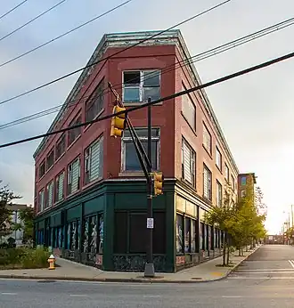 The three-story flatiron building was built in 1914 to fill in a triangular lot on the fringe of the city's central business district.[5] It has a flat roof, a steel frame, and is clad in brick with granite and marble trim, with a granite foundation[5] and cast iron fronts on the first floor.[2] Its Colonial Revival styling dates to alterations in the 1930s converting its ground-floor retail spaces into a single banking center.[2] The floor space is about 5,000 square feet on each floor.[5] Large windows surround the building on all sides.[3]