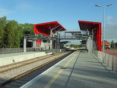 Gdańsk Kiełpinek railway station is a railway station serving the city of Gdańsk, in the Pomeranian Voivodeship, Poland. The station opened on 1 September 2015 and is located on the Gdańsk Wrzeszcz–Gdańsk Osowa railway. The train services are operated by SKM Tricity as part of the Pomorska Kolej Metropolitalna (PKM).