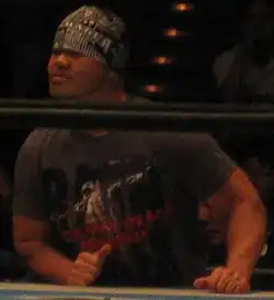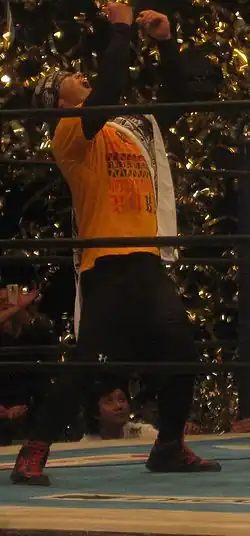 Gedo won the FMW Brass Knuckles Tag Team Championship not with Jado but with Koji Nakagawa when they defeated Masato Tanaka and Tetsuhiro Kuroda on June 13, 1999. Gedo would leave FMW in 2001 along with Masato Tanaka, Jado, Hideki Hosaka, and Kaori Nakayama with the group becoming freelancers with Gedo mostly working in Michinoku Pro. Gedo along with Jado would eventually return to New Japan and win the IWGP Junior Heavyweight Tag Team Championship when they defeated Jyushin Thunder Liger and El Samurai on July 20, 2001.[10] Gedo had a fierce rivalry with Liger after Jado and Gedo made a surprise appearance in NJPW when they both pulled Liger's mask off.[4] Jado and Gedo won the IWGP Junior Heavyweight belts for a second time in 2003 after again defeating Liger and Samurai.[11] In 2007, Gedo was offered a contract by World Wrestling Entertainment (WWE), but turned it down because he would have been required to portray a stereotypical Japanese character.[12] In July 2007, Gedo and Jado joined the Great Bash Heel (GBH) faction.[13][14] The tag team would compete in the 2007 G1 Tag League, but failed to win, with a final tally of 6 points.[15] In April 2009 Gedo and Jado left GBH and became founding members of the Chaos stable.[16] On November 13, 2010, Jado and Gedo returned to the top of New Japan's Junior Tag Team division by defeating their Chaos team mates Davey Richards and Rocky Romero in the finals of a five-day-long tournament to win the 2010 Super J Tag League.[17] As a result of their victory, Gedo and Jado received a match for the IWGP Junior Heavyweight Tag Team Championship, which took place at a Dramatic Dream Team (DDT) event on December 26, 2010, where they were defeated by the defending champions, the Golden☆Lovers (Kenny Omega and Kota Ibushi).[18] At the end of 2011, the Wrestling Observer Newsletter named Gedo and Jado the bookers of the year. They have won the award three more times since then.