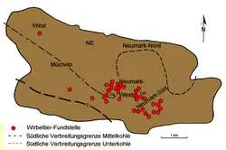 While plants and sometimes also invertebrates were found in all areas of the coal seams, vertebrates were bound to certain, more restricted sites. A total of more than 80 sites are known, 36 of which contain a significant number of vertebrate remains. These are mainly located in the Lower and Middle Coal, with around twice as many sites in the Middle Coal as in the Lower Coal. The upper coal contained only one relevant site and was otherwise largely fossil-free, which is partly due to the diagenetic changes during the Pleistocene under the influence of periglacial conditions.[9] No fossilization could be detected in the basal coal. The spatial distribution of vertebrate fossil sites reflects the conditions for the preservation of finds, which were not present to the same extent in the entire Geiseltal. As a result, the majority of vertebrate sites, especially those with complete skeletons or soft parts, are concentrated in the central and southern Geiseltal, mainly near the Neumark main sill and in the adjacent Wernsdorfer Kessel to the east. The majority of the sites are therefore located in the open-cast mines Cecilie, Leo, Geiselröhlitz and Pfännerhall and are spread over an area of around 20 km².[25] The quality of the fossil preservation decreases sharply to the north and west and partly to the east.[26][27]