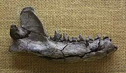 The now extinct "Creodonta" were more predatory animals. These include above all the Hyaenodonta with around 50 finds, including mainly lower jaws, but also some skulls, upper jaw fragments and isolated remains of the locomotor system. These include Eurotherium, Matthodon, Prodissopsalis and Leonhardtina, the latter two being the most common and each comprising around a dozen fossils. Overall, all creodonts found in the Geisel Valley were relatively small, with a complete skull of Eurotherium measuring around 12 cm in length.[105][106][107] A crushed skull and a single posterior upper premolar represent the true carnivores and were originally classified as Miacis, but are now classified as Quercygale.[108][109]