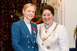 New (left), after her investiture as an Officer of the New Zealand Order of Merit by the governor-general, Dame Cindy Kiro, at Government House, Wellington, on 10 September 2024