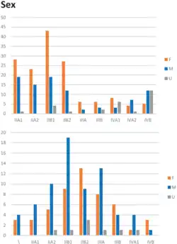 Tombs dated to the Latial period IIA contain grave goods whose gender associations in the Latial period I are incongruent with the biological sex of the deceased. One tomb from the Forum of Caesar contains a biologically female individual buried with arch fibulae, a hair rang, necklaces and a serpentine fibula and another grave from the Forum Romanum that likely contained a female individual also includes a serpentine fibula. The necropolis at the Forum Romanum also contains a grave belonging to a male individual that itself includes a spindle whorl as a burial good.[98] One grave from Osteria likely contains the skeleton of a biologically male individual who was interred alongside a necklace, a spindle whorl, hair rings, and an arch bow fibula. The presence of traditionally feminine ornaments within the burial of a likely biologically male individual compelled the archaeologist Lisa Cougle to suggest that the deceased was transgender, although the archaeologist Cecilie Brøns suggests that the individual may have been viewed as more feminine as their death occurred prior to reaching adulthood.[23] The cemetery at Osteria may reveal two other transgender burials, as two separate possibly male individuals appear entombed with arch bow fibulae and spindle whorls. However, the sex determinations of these skeletons may be unreliable, as the sex of one skeleton can only be ascertained via analysis of their tooth size, whereas the sex of the second skeleton can only be discerned based upon several fragments of their crania.[23]