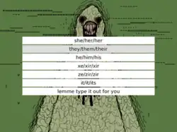 Similar to other Ren'Py visual novels, Genderwrecked is a linear work of interactive fiction in which players are able to make choices to progress the narrative. Players are invited to "discover the meaning of gender" through visiting a cast of grotesque and surreal characters based in a post-apocalyptic setting, with the choice open to the player to talk, fight or kiss each of them. Initially, players are able to select from a wide list of pronouns or input custom pronouns, which are then reflected in the game. As the player interacts with the characters, each confide in the player in how they define their own gender, with each varying in comic and surreal ways.[2] At the end of the game, it is left open to the player to define their own gender using a text box.