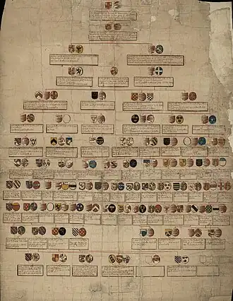 Historically, in Western societies, genealogy focused on the kinship and descent of rulers and nobles, often arguing or demonstrating the legitimacy of claims to wealth and power. Genealogy often overlapped with heraldry, which reflected the ancestry of noble houses in their coats of arms. Modern scholars regard many claimed noble ancestries as fabrications, such as the Anglo-Saxon Chronicle's tracing of the ancestry of several English kings to the god Woden.[38] With the coming of Christianity to northern Europe, Anglo-Saxon royal genealogies extended the kings' lines of ancestry from Woden back to reach the line of Biblical patriarchs: Noah[39] and Adam. (This extension offered the side-benefit of connecting pretentious rulers with the prestigious genealogy of Jesus.)[40]