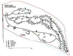 Also known as General Sibley Park and Campground, the area now includes 114 RV sites, a separate section for tent camping, two shower houses, and a day-use park with two picnic shelters, a volleyball court and a children's playground. There is also a 24-hole frisbee disc golf course. A boat dock is located at the south-east corner of the park.[8]