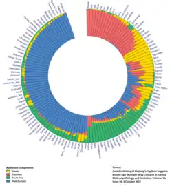- ^ Feng, Qidi; Lu, Yan; Ni, X.; Yuan, K.; Yang, Ya-jun; Yang, Xiong; Liu, Chang; Lou, H.; Ning, Zhilin; Wang, Yuchen; Lu, Dongsheng; Zhang, Chao; Zhou, Ying; Shi, Meng; Tian, L. (2017). "Genetic History of Xinjiang's Uyghurs Suggests Bronze Age Multiple-Way Contacts in Eurasia". Molecular Biology and Evolution. 34 (10): 2572–2582. doi:10.1093/molbev/msx177. PMID 28595347. S2CID 28730957.