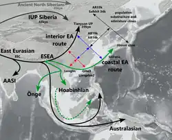 The exact patterns of the northwards dispersal of ancestral East Asians from Southeast Asia remains unclear. There may have been both an "interior route" and a "coastal route", correlating in part with the distribution and frequency of paternal haplogroup subclades.[23][1][24] Accordingly, ancient and modern East Asians can be modeled as admixture between both a deeply branching interior lineage (represented by the Tianyuan specimen) and an equally deep branching coastal lineage (represented by present-day Önge peoples). The amounts of interior and coastal contributions vary depending on each model; while one study estimated 90% interior + 10% coastal contributions,[23] others estimated between 21–26% interior + 74–79% coastal contributions,[24] or nearly equal amounts of interior and coastal contributions (51–56% and 44–49% respectively).[25][26] There are also alternative scenarios for the divergence patterns of ancient East Asians without a distinct interior/coastal dispersal.[1][17] Wang et al. 2025 found further evidence for that ancient and present-day East Asians formed as admixture between two basal Asian sources, specifically between a lineage represented by the Xingyi_EN specimen, and a lineage represented by the Tianyuan specimen.[27]