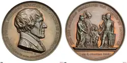 One year before retiring he received a medal commemorating his 50th anniversary of working at the gymnasium. This medal made by the local engraver Heinrich Friedrich Brehmer links Grotefend's jubilee with the 500th anniversary of the school where he taught. Both occasions were celebrated on 2 February 1848.[3]