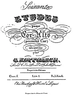 Kopprasch wrote two sets of sixty etudes for horn, opus 5 for high horn and 6 for low horn, however only opus 6 (low horn) gained wide popularity, and is still published today—typically in two books of thirty each. Some early publications incorrectly attribute "C" Kopprasch. These etudes have also been transcribed for other brass instruments, such as trumpet, trombone and tuba.[3]