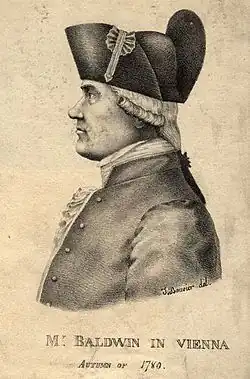 While pausing in Vienna on their way to Britain, Jane was celebrated in society: a bust of her was made for Joseph II, Holy Roman Emperor by the Italian sculptor Giuseppe Ceracchi and Count Wenzel Anton Kaunitz-Rietberg commissioned a full-length portrait.[2] In London, she was painted by Joshua Reynolds, William Pyne and Richard Cosway. Baldwin became popular in society and became an acquaintance of William Blake, who mentions him and Cosway in one of his poems.[1] It was his friendship with Cosway that led to his introduction into the field of magnetic therapy, the theory that magnetic force had healing powers.