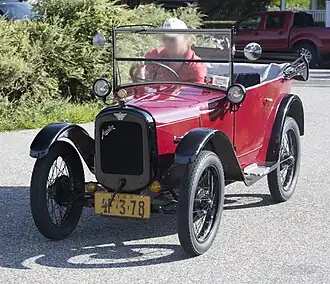 In the late-1920s George Clarke began to develop a comedy sketch which involved him driving a car on stage. In his obituary in The Performer magazine it was described as "his most outstanding sketch".[3] The vehicle was a yellow open-top Austin Seven Chummy Tourer, with blue mud-guards, a standard production-line car except for the finish on the body. Clarke expertly manoeuvred the vehicle for dramatic and comedic effect by the adept use of gears and brakes. He drove the car about the stage "with almost uncanny skill", giving the impression he had lost control of the vehicle. At one stage he would drive the car straight at the footlights, causing considerable consternation to the audience in the front rows; at the last moment he would change from first gear into reverse; the back of the vehicle would jump up in characteristic fashion before shooting backwards.[37][3][38] Clarke may have begun to develop the sketch in the mid-1920s. One source describes him performing a routine in 1925 at the Palace Theatre in Plymouth which involved him driving "a brand new yellow Austin Seven car on the stage". Described as "the dapper little dude comedian", Clarke dared his infant daughter to bounce, "lest she broke the springs".[39]