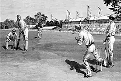 Ignoring his team's umpire Edmund Barton, who deemed the run out fair,[69] New South Wales captain Dave Gregory threatened to abandon the match unless Harris had Coulthard replaced.[70] While the captains conferred, one of the English fieldsmen inflamed the situation by addressing hecklers in the crowd as "nothing but 'sons of convicts'".[71] At this point, up to 2,000 "roughs and larrikins" surged onto the pitch.[72] Some of the England players armed themselves with stumps as defensive weapons.[72] Harris, in defending Coulthard, was struck with a heavy stick, and A. N. "Monkey" Hornby collared and dragged the assailant to the pavilion, taking punches and nearly losing his shirt in the process.[73] Powerless to restore order, the mounted police were able to rescue Coulthard only after a lengthy struggle and with the help of volunteers.[74][75] Two attempts were made to resume the match, but when the rioters learned of Harris' refusal to withdraw Coulthard, they again rushed the ground and stayed there until the scheduled end of play.[70] Outside the ground, Coulthard was cornered by a 200-strong mob but escaped without further trouble when a group of sailors intervened and "polished off" his would-be attackers.[76]