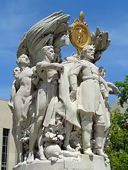 Grafly was a founder of the National Sculpture Society and longtime educator at the Pennsylvania Academy of the Fine Arts who was best known for his portrait busts. Although Grafly was at the peak of his career, the CGA was hesitant in approving him to design the sculpture because his symbolic works had been criticized for being incomprehensible. The CFA finally agreed to consider Grafly and following several months of negotiations and changes, a preliminary sculpture design was approved in August 1918.[4] Grafly received $85,000 for his commission.[5] Several years of bickering about the final design and location of the memorial passed until March 28, 1922, when an official groundbreaking ceremony took place.[4][5] The chosen site was near 3rd Street NW in Union Square, a public park on Capitol Hill, and close to the large Ulysses S. Grant Memorial. Before the memorial was installed, the last of the old Botanic Garden greenhouses were demolished and the Bartholdi Fountain was moved to make way.[4] The architects chosen to design the memorial were Grant Simon and Edward P. Simon of Philadelphia. Piccirilli Brothers carved the memorial and the project contractor was the George A. Fuller Company.[5] The total cost of the memorial and its installation was $400,000.[6]