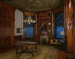 Herzog's interiors—commonly consisting of wall as well as ceiling treatments—mixed meticulous German training with late-Victorian American tastes. Their closest analog is the oeuvre of the Herter Brothers, European-trained partners who designed interiors for New York's elite. Like the Herter Brothers, Herzog frequently exercised control over the entire interior design process, including walls, ceilings, furniture, draperies and glass.[3]