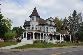 George I. Wilber House is a historic home located at Oneonta in Otsego County, New York. It was built in two phases, 1875 and about 1890. It is a three-story wood-frame structure on a stone foundation in the Queen Anne style. It features a three-story, round corner tower, cross gabled roof, and a large, very decorative wrap-around porch with a porte-cochere. In 1997 it became home to the Upper Catskill Community Council of the Arts.[2]