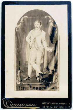 George Lippert (1844, Bavaria – July 1906, Salem, Oregon),[1] was born with three legs and, as was discovered during his autopsy, two hearts.[2] He worked as a curiosity for nearly 50 years, many of them for P. T. Barnum.[2] Although he claimed that his third leg was fully functional until it was fractured in an accident, this has not been firmly established.[3]