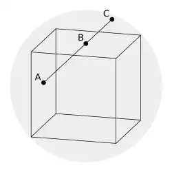The second occurrence is in a cube. If one connects the centers A and B of any two cube adjacent faces and extends the connecting line segment again, such that the extended line intersects the circumscribed sphere at C, then B will divide AC according to the golden section.[3]
