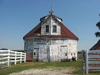 George Rudicel Polygonal Barn is a historic 12-sided barn located in Noble Township, Shelby County, Indiana, USA. It was built in 1910 and is a two-story, vernacular frame barn. It is topped by a cone roof with a large dormer and square cupola.[2]: 5