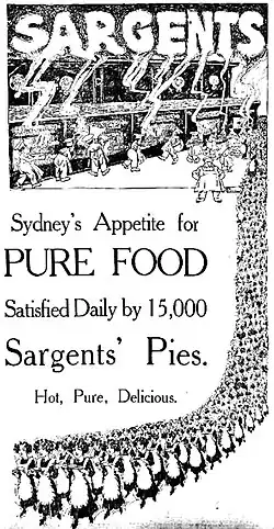 By 1913, Sargents were producing 125,000 meat pies per week at their factory in Burton Street, Darlinghurst and, by 1915, were operating 36 refreshment rooms and shops.[17][18] The company opened a refreshment room in Melbourne, in 1909.[19] The company made, meat pies, fruit pies, pastries, and even wedding cakes.[20]