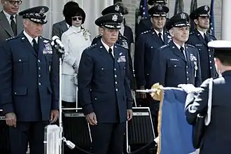 General George S. Brown was sworn in as the eighth Chief of Staff of the United States Air Force on August 1, 1973. In this capacity Brown oversaw all United States major operations both domestic and international and all Air Force related projects, such as the development of the new fighter and bomber aircraft project which resulted in the F-15 and F-16 fighter aircraft and the B-1B strategic bomber aircraft. Brown emphasized the need of the modernization of United States Air Force Aircraft fleet following the Vietnam War and for the long-term future, in order to deter the growing Soviet weapon arsenal.[29] Brown also emphasized the important role of Strategic Air Command as United States primary nuclear deterrence.[29] Brown also emphasized the need of a new and modern missile that could strengthen the ballistic-missile as part of the Nuclear Triad, as a result the Air Force began the development of the new MX missiles.[29][30][31]