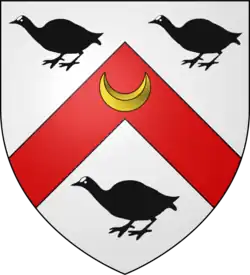 Arms of the Southcote family of Calverleigh. Argent, a chevron gules, between three coots sable, a cressent or for difference.
