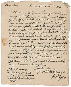 Little is known of Taylor's life before he arrived in Philadelphia in 1736, although there is general agreement that he was born in Northern Ireland (possibly Ulster).[1] His wife Ann Taylor's lineage, however, is well documented. Her grandfather, John Taylor, came to Pennsylvania from Wiltshire, England, in 1684 and became surveyor general of Chester County, Pennsylvania, which then accounted for about one-third of the colony. Later, her father, Isaac Taylor, served as Chester County's deputy surveyor general. Ann's family belonged to the Society of Friends, but she was disowned as a Quaker in 1733 for her marriage outside the circle to Samuel Savage Jr.[3]