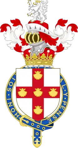 Garter-encircled shield of arms of George Villiers, 6th Earl of Clarendon, KG, as displayed on his Order of the Garter stall plate in St. George's Chapel, viz. Argent on a cross gules five escallops or.