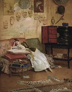 Most of Croegaert’s portraits of elegant young women are distinguished by their lavish detail. The influence of his relation, Jan Jacob Croegaert-Van Bree, is suspected in the elegance and realism of his style.[3] When he arrived in Paris portrait paintings depicting the lifestyle of contemporary, fashionable city dwellers had become popular. The trend was started in Paris in the late 1850s by the Belgian painter Alfred Stevens and was then adopted by other Belgian painters working in Paris such as Charles Baugniet and Gustave Léonard de Jonghe and the Frenchman Auguste Toulmouche.[5] By the late 1860s there was a ready market for genre scenes with bourgeois figures, usually young glamorous women, depicted in sumptuous surroundings.[6] With the onset of the Belle Epoque in the 1870s, this type of paintings depicting fashionable women set in an interior became popular at the Paris Salon.[5]