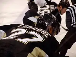 Laraque's parents were both born in Haiti and immigrated to Canada; he was born in Montreal, Quebec.[17] During his NHL career, he was nicknamed "Big Georges", sometimes shortened to "BGL". His brother Jules-Edy Laraque also played ice hockey in the QMJHL, while his cousin Jean-Luc Grand-Pierre played in the NHL and various European leagues.[18][19] His first cousin, once removed, Dennyn Grand-Pierre, also played collegiate hockey in the second division of the ACHA.[20] Laraque has twins who both play minor hockey in Edmonton. His daughter, Milayna, plays with the Edmonton Ice in the Alberta Female Hockey League, and his son, Marcus, plays with HC Edmonton in the Junior Prospects Hockey League.[21][22]