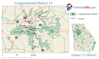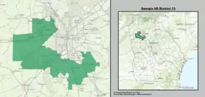 Georgia's 13th congressional district is a congressional district in the U.S. state of Georgia. The district is currently represented by Democrat David Scott, though the district's boundaries have been redrawn following the 2010 census, which granted an additional congressional seat to Georgia.[4] The first election using the new district boundaries (listed below) were the 2012 congressional elections.